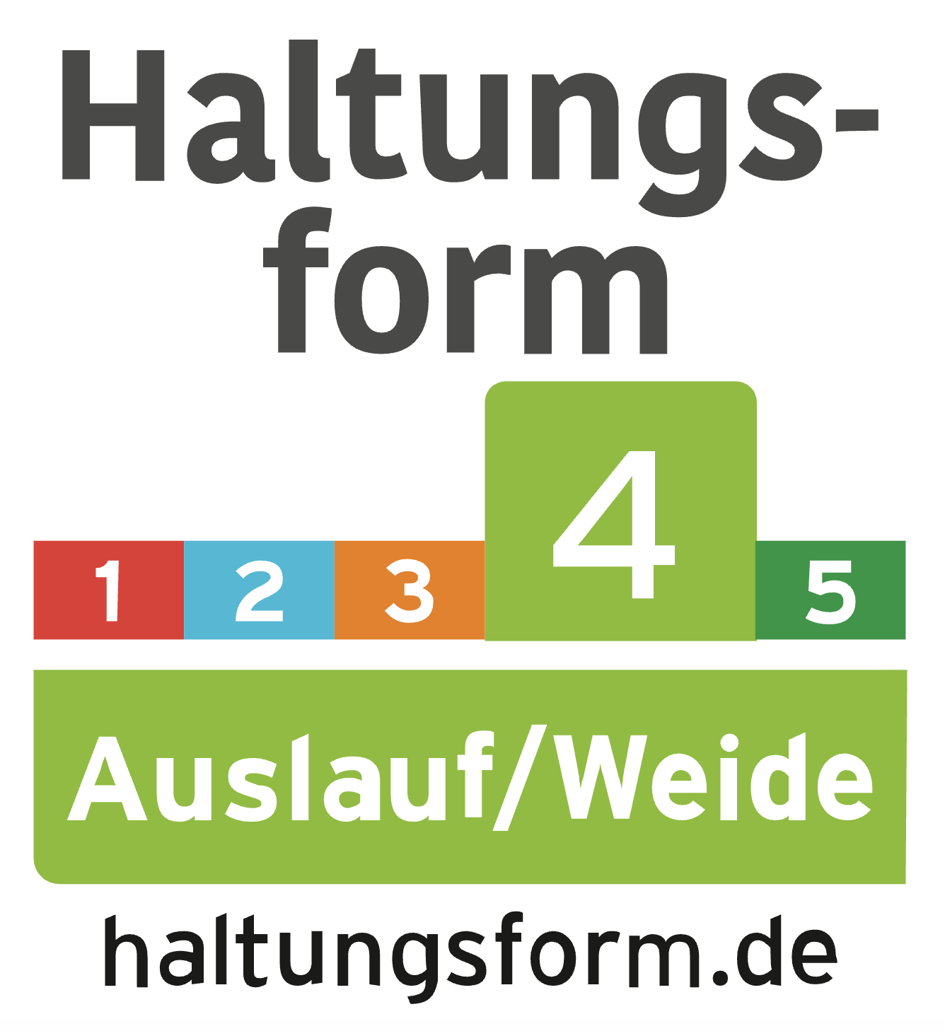 A German animal welfare certification label from the Haltungsform scheme, which demonstrates good label design. The green text translates to “free-range” (literally: Paddock/Pasture).